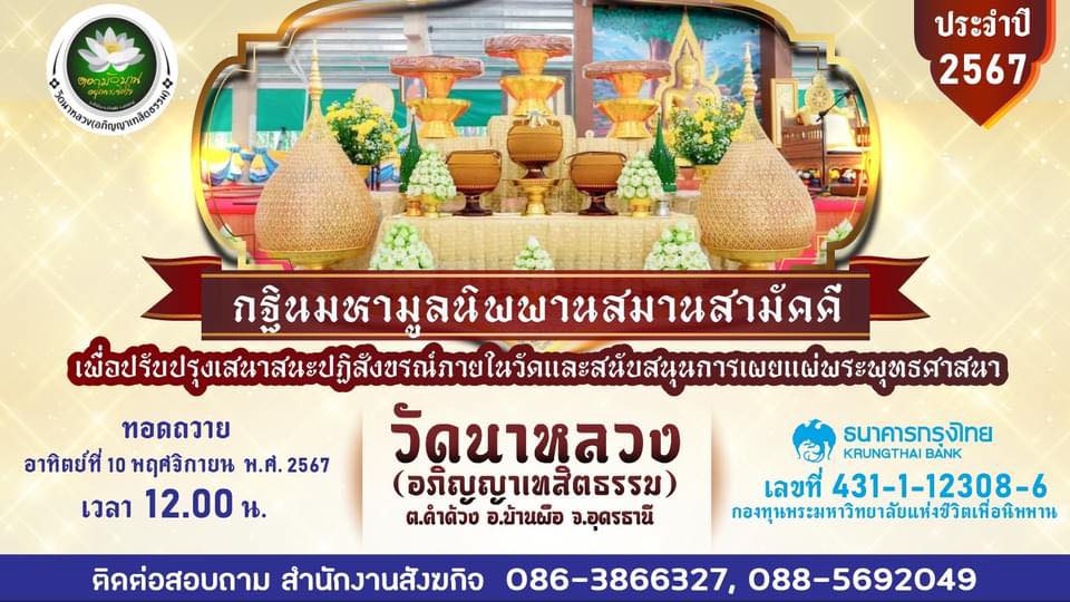 ขอเชิญท่านสาธุชนคนดี ร่วมจองเป็นเจ้าภาพกฐินกองทุนมหามูลนิพพานสมานสามัคคี ประจำปี ๒๕๖๗ ณ วัดนาหลวง (อภิญญาเทสิตธรรม) ต.คำด้วง อ.บ้านผือ จ.อุดรธานี ตรงกับ วันเสาร์ -อาทิตย์ ที่ ๙-๑๐ พฤศจิกายน ๒๕๖๗